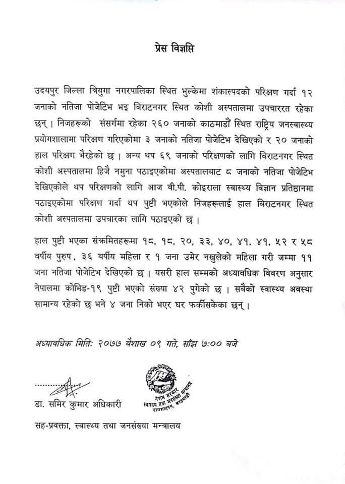 उदयपुरमा थप ८ जनामा कोरोना भाइरस (कोभिड-१९) को संक्रमण पुष्टि भएको छ ।