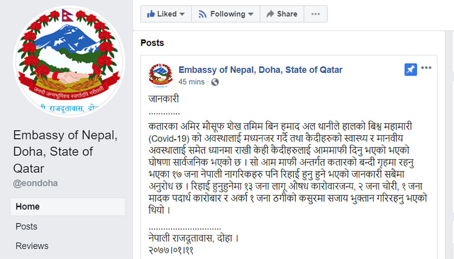 कोरोना भाइरसको महामारी फैलिएकाले कैदीहरुको स्वास्थ्य र मानवीय अवस्थालाई ध्यानमा राखेर कतारका राजाले केही कैदीहरुलाई आममाफी दिने निर्णय गरेका छन् । सोही निर्णयअनुसार १७ जना नेपालीले पनि आममाफी पाएका दोहास्थित नेपाली दूतावासले जनाएको छ ।