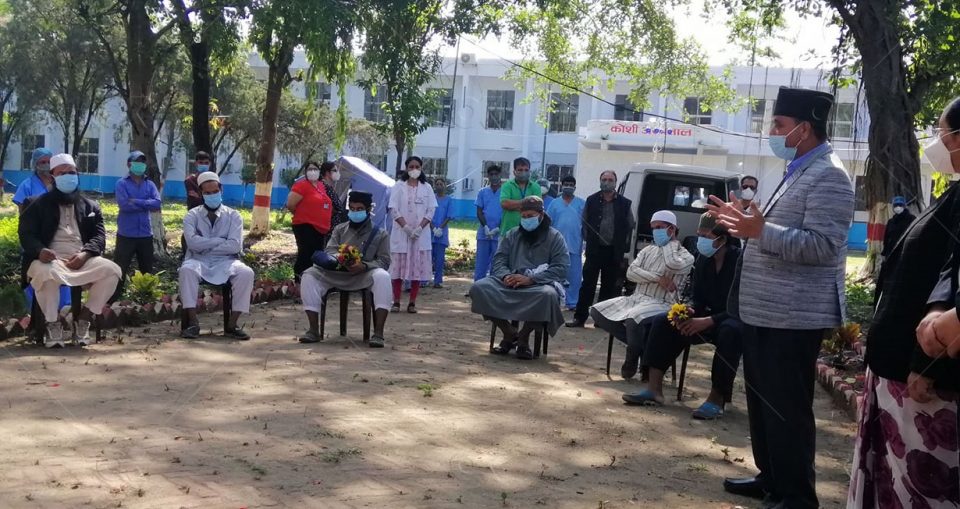 उदयपुरको त्रियुगा नगरपालिका भुल्केस्थित मस्जिदमा बसेका भारतीय जमातीमध्ये ५ र ६ वैशाखमा १३ जनामा कोरोना संक्रमण पुष्टि भएको थियो । उनीहरुमध्ये ६ जना निको भएर डिस्चार्ज भएका हुन् । उनीहरुलाई फूलका गुच्छा दिएर विदाई गरिएको छ ।
