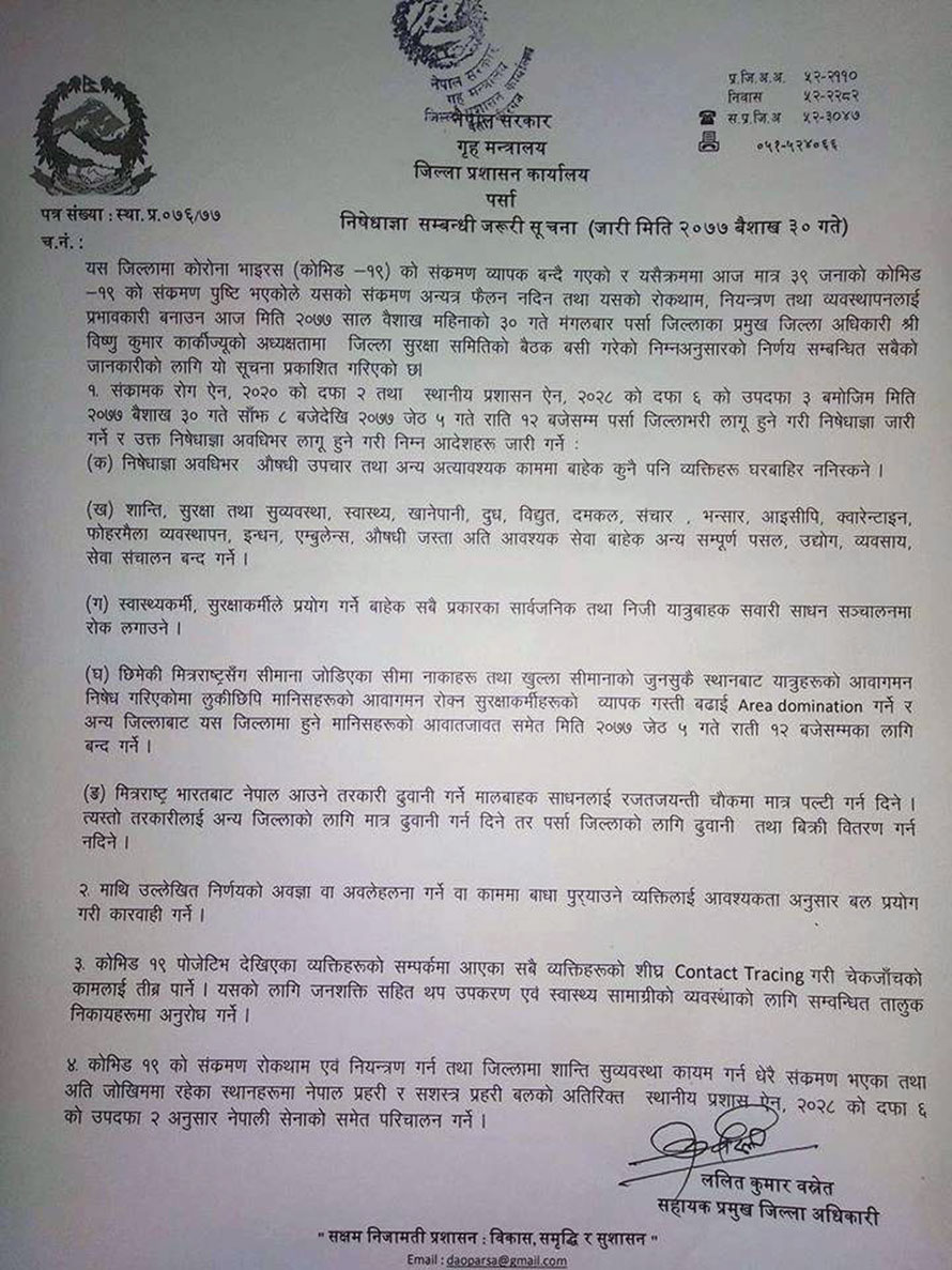 पर्सा जिल्लाबाट अन्य जिल्लामा र अन्य जिल्लामा पर्सा जिल्लाबाट हुने आवतजावत जेठ ५ गते राति १२ बजेसम्म बन्द गरिएको छ ।