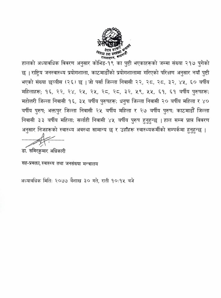 ट्रेंडिंग स्वास्थ्यकाठमाडौं र भक्तपुरमा सहित थप २६ जनामा कोरोना संक्रमण by कोर्पोरट आवाज डट कम३० बैशाख २०७७, मंगलवार ११:३५0251 Share0 काठमाडौं र भक्तपुरमा तीन जना सहित थप २६ जनामा कोरोना संक्रमण भेटिएको छ । सोमबार राति सवा १० बजे स्वास्थ्य मन्त्रालयले जारी गरेको विज्ञप्ति अनुसार अहिलेसम्म नेपालमा संक्रमितको संख्या कुल २१७ पुगेको छ ।