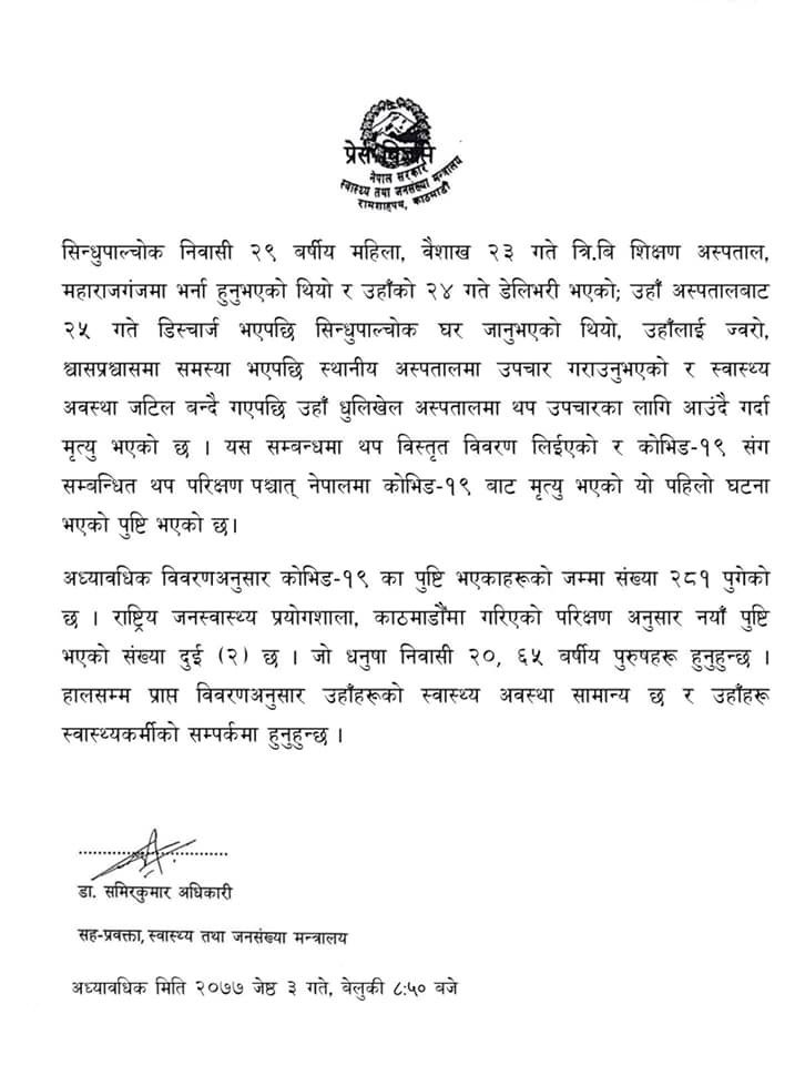 टोलीको रिपोर्टका आधारमा मन्त्रालयले उनको मृत्यु कोरोनाका कारण भएको घोषणा गरेको छ । मन्त्रालयले शनिबार साँझ विज्ञप्ति जारी गर्दै भनेको छ, ‘… विस्स्वृत विवरण लिइएको र कोभिड-१९ सँग सम्वन्धित थप परीक्षण पश्चात नेपालमा कोभिड-१९ बाट मृत्युभएको पहिलो घटना भएको पुष्टि भएको छ ।’