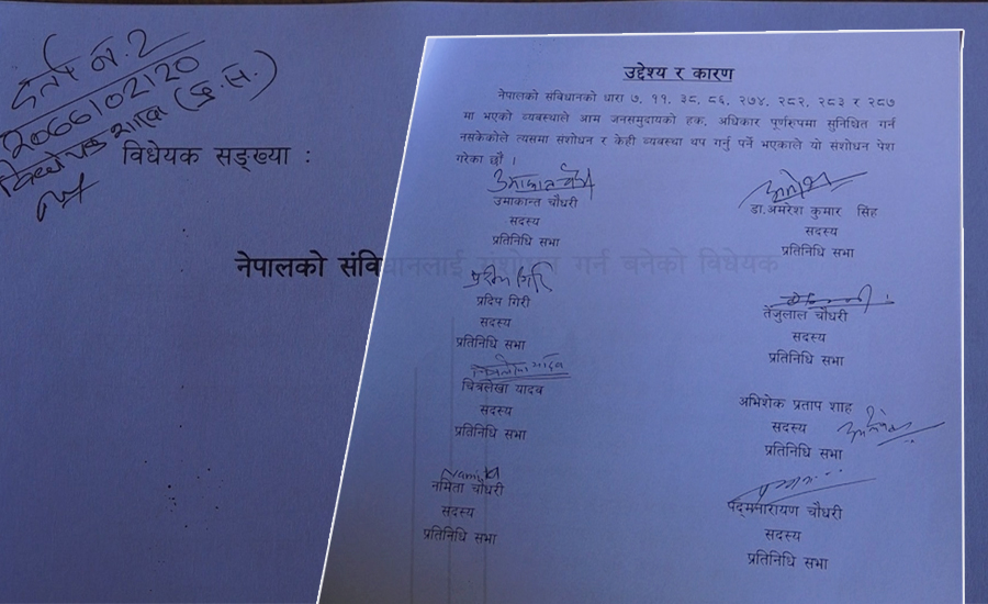 तर संसद सचिवालयमा भने एकपछि अर्को गैरसरकारी विधेयकका रुपमा संविधान संशोधन प्रस्ताव दर्ता भएको छ । मंगलबार प्रमुख प्रतिपक्षी नेपाली कांग्रेसका ८ जना सांसदहरुले संविधान संशोधन प्रस्ताव दर्ता गरेका छन् ।