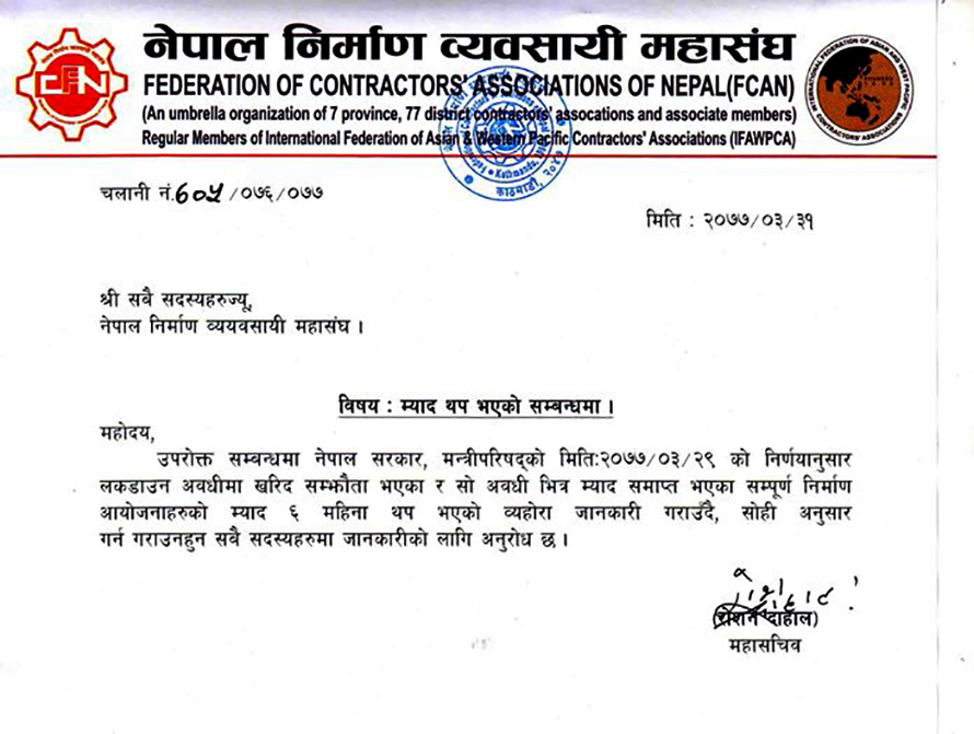 सोमबार बसेको मन्त्रिपरिषद् बैठकले लकडाउनको अवधिमा म्याद सकिएका र नियमित काम भइरहेका आयोजनाहरूलाई ६ महिना थप समय दिने निर्णय भएको जानकारी प्राप्त भएको नेपाल निर्माण व्यवसायी महासंघले जानकारी दिएको छ ।
