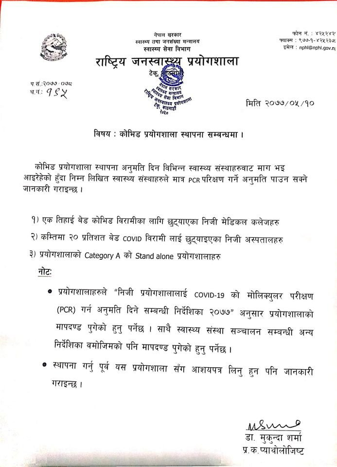 राष्ट्रिय जनस्वास्थ्य प्रयोगशााला टेकुले सूचना जारी गर्दै निजी अस्पतालले २० प्रतिशत र मेडिकल कलेजले एक तिहाइ बेड छुट्याए पिसिआर परीक्षणको अनुमति प्रदान गरिने जनाएको हो।