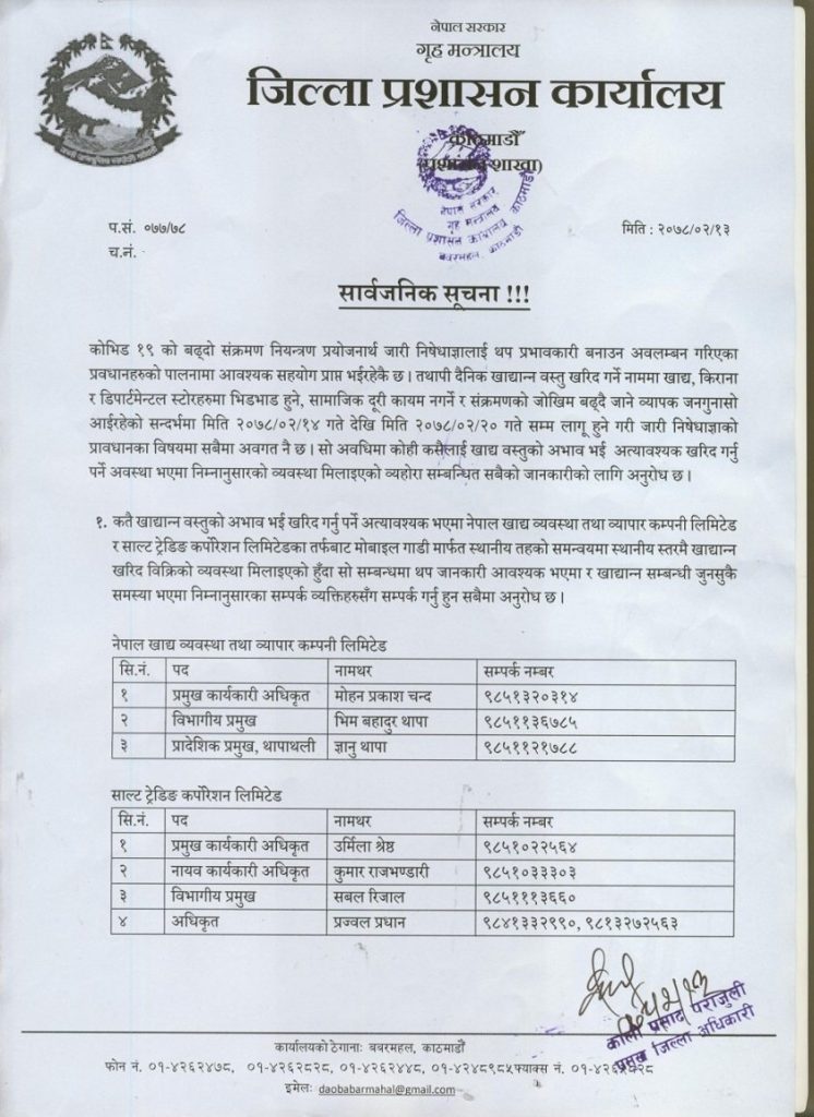 नेपाल खाद्य व्यवस्था तथा व्यापार कम्पनी लिमिटेड र साल्ट ट्रेडिङ कर्पोरेशन लिमिटेडको तर्फबाट मोबाइल गाडीमार्फत काठमाडौं उपत्यका भित्रका घर–घरमा सामान बिक्री वितरण गर्ने प्रबन्ध प्रशासनले मिलाएको छ । काठमाडौं जिल्ला प्रशासनले विज्ञप्ति जारी गरेर सम्पर्कका लागि नम्बर समेत दिएको छ ।