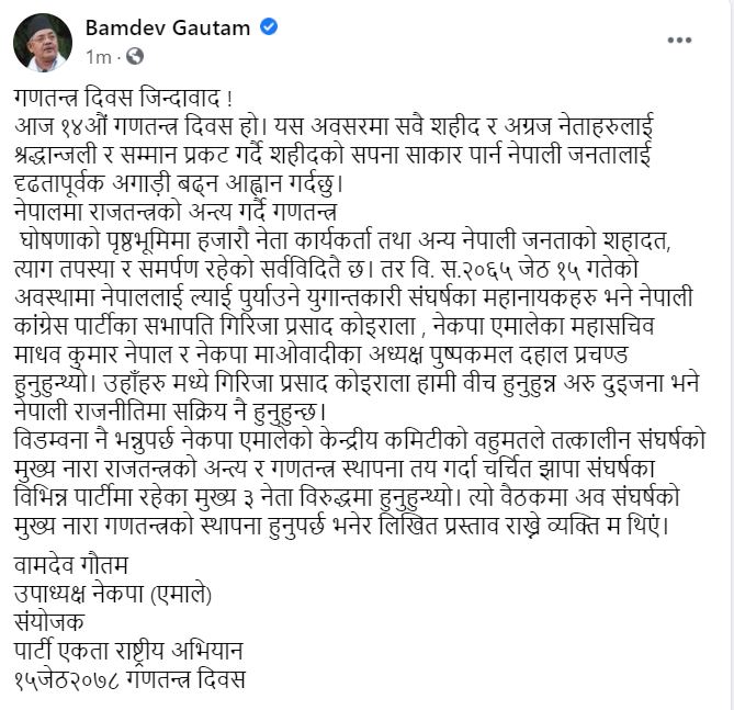 पछिल्लो समय देशमा राजनीतिक उथलपुथल भईरहेका बेला समेत प्रायः चुप रहेका नेकपा एमालेका नेता वामदेव गौतमले गणतन्त्र दिवसका अवसरमा मुख खोलेका छन् । प्रचण्ड र माधव नेपाललाई गणतन्त्र स्थापनाको युगान्तकारी संघर्षका महानायकको संज्ञा दिएका हुन् ।