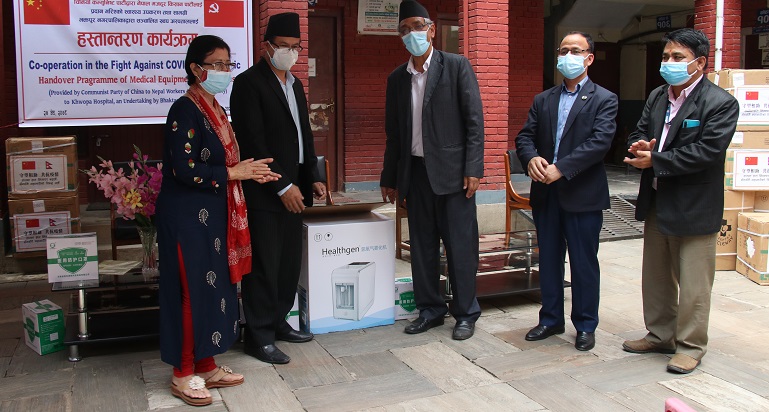 चिनियाँ कम्युनिष्ट पार्टीले नेपाल मजदुर किसान पार्टीलाई उपलब्ध गराएको स्वास्थ्य सामाग्रीमध्ये १५ हजार थान एन ९५ मेडिकल मास्क र ५ थान हाइड्रोजन अक्सिजन जेनेरेटर मेसिन ख्वप अस्पताललाई हस्तान्तरण गरिएको छ । सोमबार एक समारोहबीच उक्त सामाग्री पार्टी सचिव प्रेम सुवालले हस्तान्तरण गरेका हुन ।