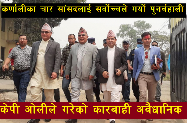 सर्वोच्च अदालतले एमालेबाट निर्वाचित कर्णाली प्रदेश सभा सदस्यहरूको पद पुनर्बहाली गरेको छ । पार्टी ह्वीपविपरीत मुख्यमन्त्री महेन्द्रबहादुर शाहीलाई विश्वासको मत दिने एमालेका चार सांसदको पद सर्वोच्चको बिहीबारको आदेशले पुनर्बहाली भएको हो ।