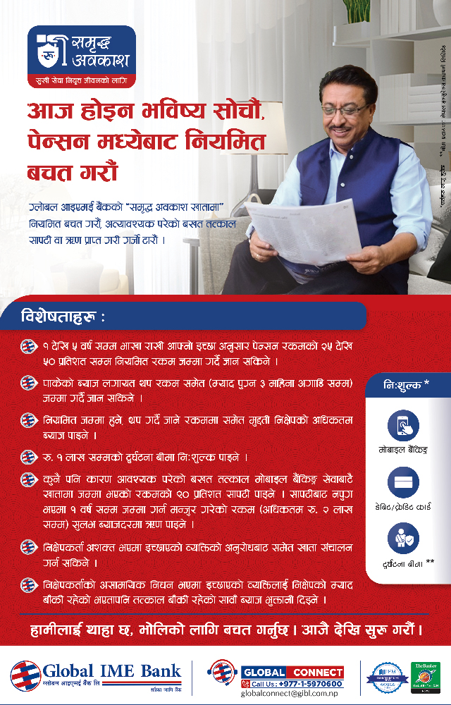 ग्लोबल आइएमई बैंक लिमिटेडले निवृत्तिभरण प्राप्त गर्ने अवकास प्राप्त कर्मचारीहरूलाई लक्षित गरी ग्लोबल समृद्ध अवकास मुद्दती खाता सञ्चालनमा ल्याएकोछ । यस खाता अन्तर्गत बैंकले आफ्ना ग्राहकहरूलाई निक्षेपमा उच्च प्रतिफल, कर्जामा विशेष सहुलियत र व्यक्ति विशेष सेवा उपलब्ध गराउनेछ ।