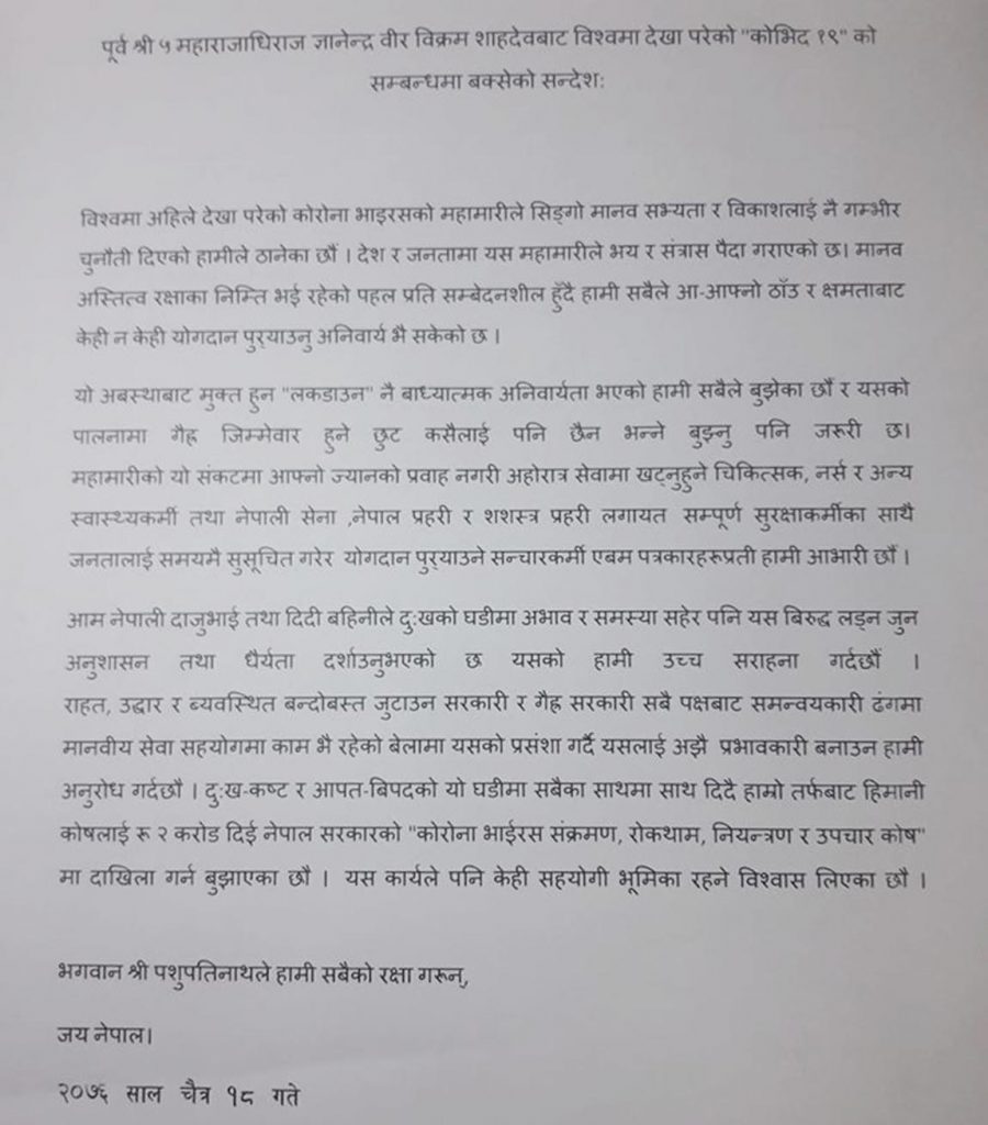 विज्ञप्तिमा महामारीले देश र जनतामा सन्त्रास पैदा भएको उल्लेख गर्दै ज्ञानेन्द्रले यो रकमको घोषणा गरेका हुन्। उनले विज्ञप्तिमा लकडाउनलाई बाध्यात्मक अनिवार्यताको संज्ञा दिएका छन्। उनले यसमा कोही पनि गैरजिम्मेवार हुनु नहुने कुरामा जोड दिएका छन्।