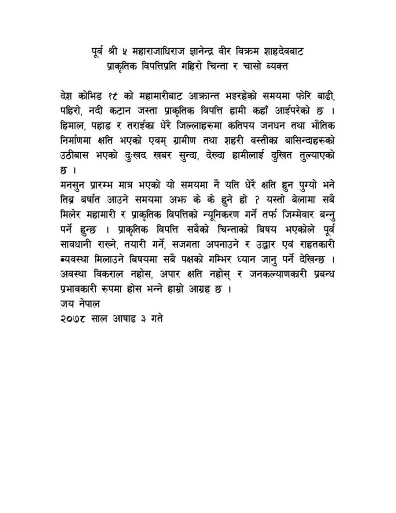 आज एक विज्ञप्ति जारी गर्दै पूर्व राजा शाहले मनसुन प्रारम्भ मात्र भएको समयमा नै यति धेरै क्षति भएको भन्दै तीब्र वर्षातको समयमा अझै अवस्था कस्तो होला भन्ने चिन्ता व्यक्त गरेका छन् ।