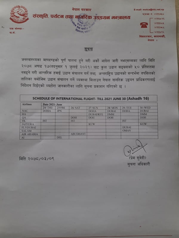 काठमाडौं। सरकारले आन्तरिक तगा अन्तर्राष्ट्रिय हवाई सेवालाई नियमित गर्ने निर्णय गरेपछि संस्कृति, पर्यटन तथा नागरिक उड्डयन मन्त्रालयले बुधबार उडान तालिका सार्वज्निक गरेको छ। मन्त्रालयले बुधबार असार १७ बाट आन्तरिक उडान गर्ने तालिका सार्वजनिक गरेको हो।