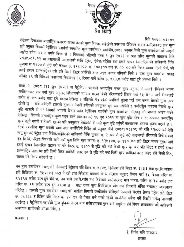 प्रवक्ता उपाध्यायका अनुसार पेट्रोल, जिडेल, मट्टीतेल तथा हवाई इन्धन आन्तरिक र अन्तर्राष्ट्रिय दुवैतर्फ बढेको छ । पेट्रोल, जिडेल, मट्टीतेलको मूल्य प्रतिलिटर २ रुपैयाँका दरले बढेको हो।