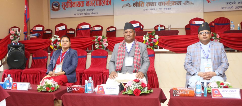 भक्तपुर, १० असार । सूर्यविनायक नगरपालिकाले स्वास्थ्य, शिक्षा, कृषि र पर्यटनलाई उच्च प्राथमिकतामा राख्दै नीति तथा कार्यक्रम सार्वजनिक गरेको छ ।