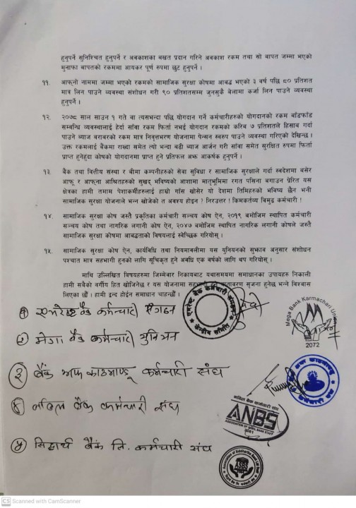 काठमाडौं । बैंक तथा वित्तीय संस्थाका कर्मचारीहरूले आफूहरूले उठाएका मागहरू सम्बोधन नभएसम्म सामाजिक सुरक्षा कोषमा आवद्ध नहुने घोषणा गरेका छन् । आज बिहिबार संयुक्त प्रेस विज्ञप्ती जारी गर्दै वाणिज्य बैंकदेखि बीमा कम्पनी र लघुवित्त कम्पनीका कर्मचारी संगठनहरूले यस्तो घोषणा गरेका हुन् ।