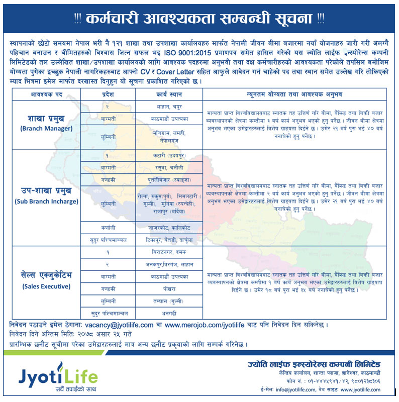 ज्योति लाइफ इन्स्योरेन्स कम्पनीद्वारा नेपाल भरका विभिन्न शाखा तथा उपशाखाहरुमा विभिन्न पदका लागि कर्मचारीको माग गरेको छ । ज्योतिलाइफले नेपालका विभिन्न प्रदेशमा शाखा प्रमुख, उपशाखा प्रमुख तथा सेल्स एक्जुकेटिभका लागि केही संख्या मा कर्मचारीको माग गरेको छ । आवेदन दिनको लागि न्यूनतम शैक्षिक योग्यता स्नातक रहेको र २१ वर्ष देखी ४० बर्ष सम्म हुनुपर्ने रहेको । योग्यता पुगेका ईच्छुक व्यक्तिले आबेदन दिन चाहेको पद तथा स्थान प्रष्ट उल्लेख गरि असार २५ गते भित्र आवेदन दिइ सक्नुपर्नेछ ।आवेदकहरुको लागि २०७८ अषाढ २५ सम्म ईमेल ठेगाना vacancy@jyotilife.com वा www.merojob/jyotilife मार्फत आवेदनदिनपाउने व्यवस्था गराएको छ ।