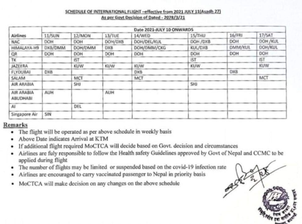 तर, कोरोना भाइरसको महामारीको अवस्था हेरी तोकिएको तालिकामा समेत थपघट भने हुन सक्ने प्राधिकरणको भनाइ छ । सबै वायुसेवा कम्पनीले तोकिएका स्वास्थ्य मापदण्ड र आवश्यक कागजातको निश्चित गर्नुपर्छ ।
