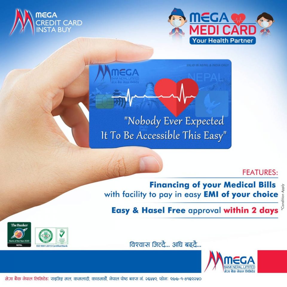 मेगा बैंक नेपाल लिमिटेडले आफ्ना ग्राहकहरुलाई अस्पतालमा उपचार गर्नका लागि आवश्यक रकम उपलब्ध गराउने उद्देश्यले ‘मेगा मेडि कार्ड’ नामक आकर्षक सुविधा ल्याएको छ ।