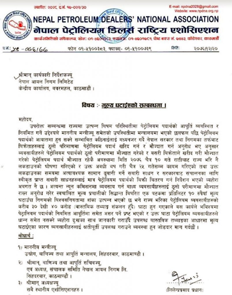 निगमले बुधबार डिजेल र पेट्रोलमा प्रतिलिटर १० रुपैयाँ मूल्य घटाएको थियो । आफूहरुले महँगो मूल्यमा किनेर इन्धन भण्डारण गरेको, तर अहिले लकडाउनको बेला एकैचोटि धेरै मूल्य घटाइदिँदा घाटा भएको व्यवसायीहरुको भनाइ छ ।