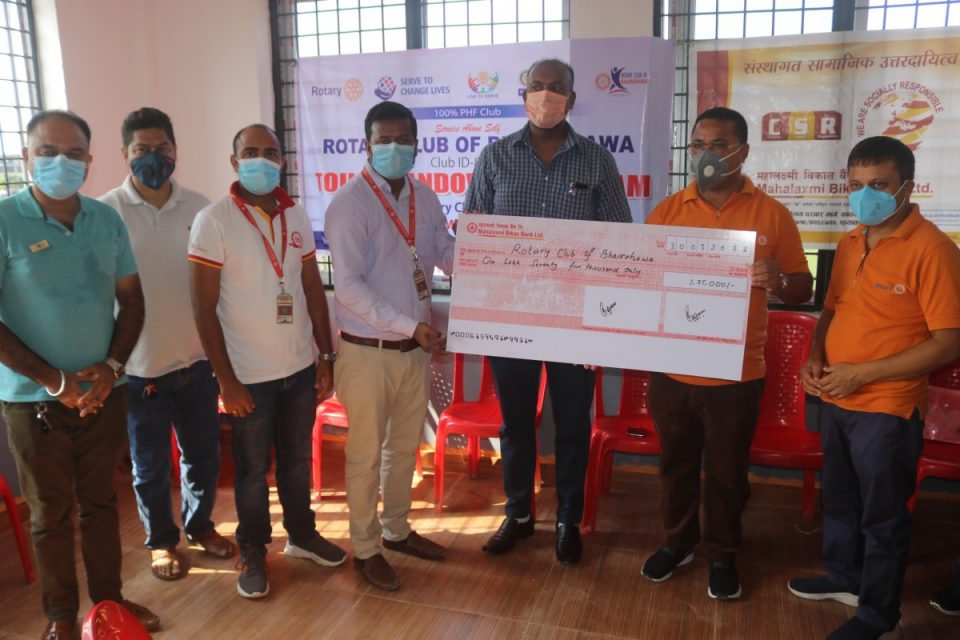 यहि मिति २०७८÷०३÷३० गते रोटरी क्लब अफ भैरहवाका संस्थापक अध्यक्ष तथा रोटरी डिस्ट्रिक ३२९२ रिजन २१ का एसिस्टेन्ट गभर्नर श्री राजकुमार गुप्ताको प्रमुख आतिथ्यतामा बेलहिया माध्यामिक विद्यालयको प्राङगणमा सम्पन्न एक कार्यक्रमका बीच बैंकको भैरहवा शाखाका प्रबन्धक श्रीे गौतम गुप्ताले रोटरी क्लब अफ भैरहवाका अध्यक्ष श्री चक्रमणि आचार्यज्यूलाई रु. एक लाख पचहत्तर हजार रकमको चेक हस्तान्तरण गर्नुभएको थियो । उल्लेखित कार्यक्रम रोटरी क्लब अफ भैरहवाका अध्यक्ष श्री चक्रमणि आचार्यज्यूको अध्यक्षता तथा सचिव साजन जंग राणाज्यूको संचालनमा सम्पन्न भएको थियो ।