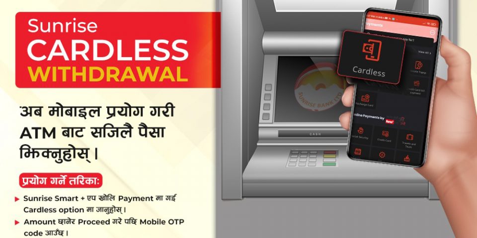 सनराइज बैंकले कार्डलेस भुक्तानी सेवाको सुरुवात गरेको छ । हालसम्म ग्राहकहरुले आफ्नो डेबिट कार्डको प्रयोग गरी एटीएम मेसिनबाट रकम झिक्दै आएकोमा अब सनराइज बैंकको कार्डलेस भुक्तानी प्रयोग गरी कार्डको प्रयोग बिना नै एटीएमबाट रकम झिक्न सक्नेछन् ।