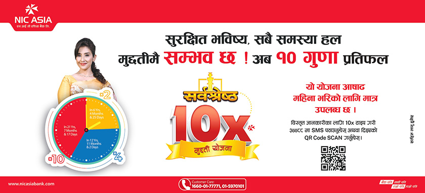 एनआईसी एशिया बैंकले पछिल्लो पटक निक्षेप रकमको १० गुणासम्म रकम फिर्ता हुने सर्वाधिक उच्च ब्याजदर सहितको नवीनतम ‘एनआईसी एशिया सर्वश्रेष्ठ १० गुणा मुद्दती योजना’ ल्याएको छ । यो नयाँ योजना अझै लोकप्रिय हुने विश्वास बैंकले लिएको छ ।