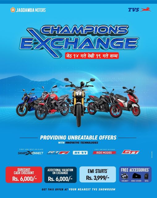आजै TVS ” Champions Exchange” अफर फाइदा उठाई आफ्नो कुनै पनि पुरानो मोटरसाइकल वा स्कुटरको Exchange गरी नयाँ TVS घर चढेर जानुहोस्।