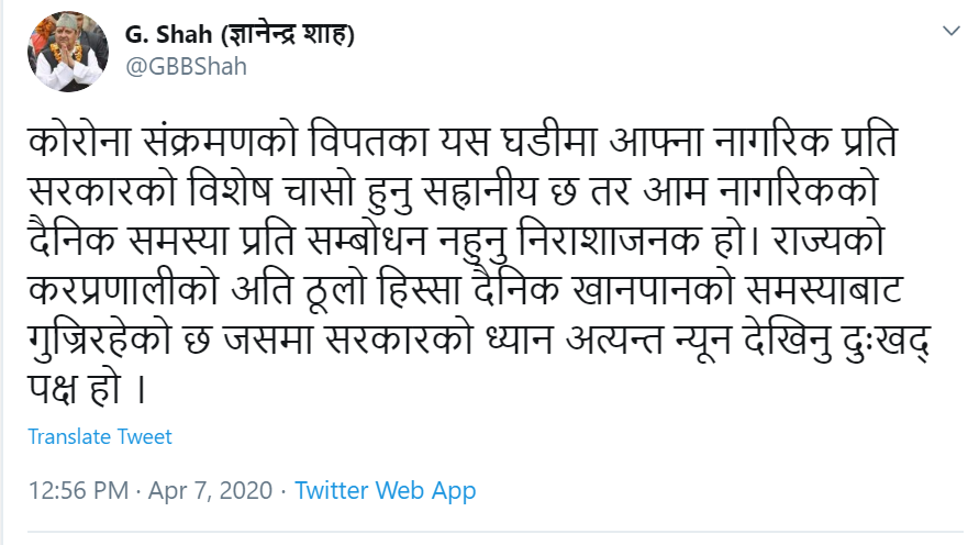 सामाजिक सजालमार्फत् आफ्नो धारणा राख्दै पूर्वराजा शाहले सरकारले नागरिकको दैनिक समस्याप्रति सम्बोधन नै गर्न नसकेको आरोप लगाएका छन् । उनले राज्यको कर प्रणालीको अति ठूलो हिस्सा दैनिक खानपानको समस्याबाट गुज्रिरहँदा पनि सरकारको ध्यान भने जान नसकेको टिप्पण गरेका छन् ।