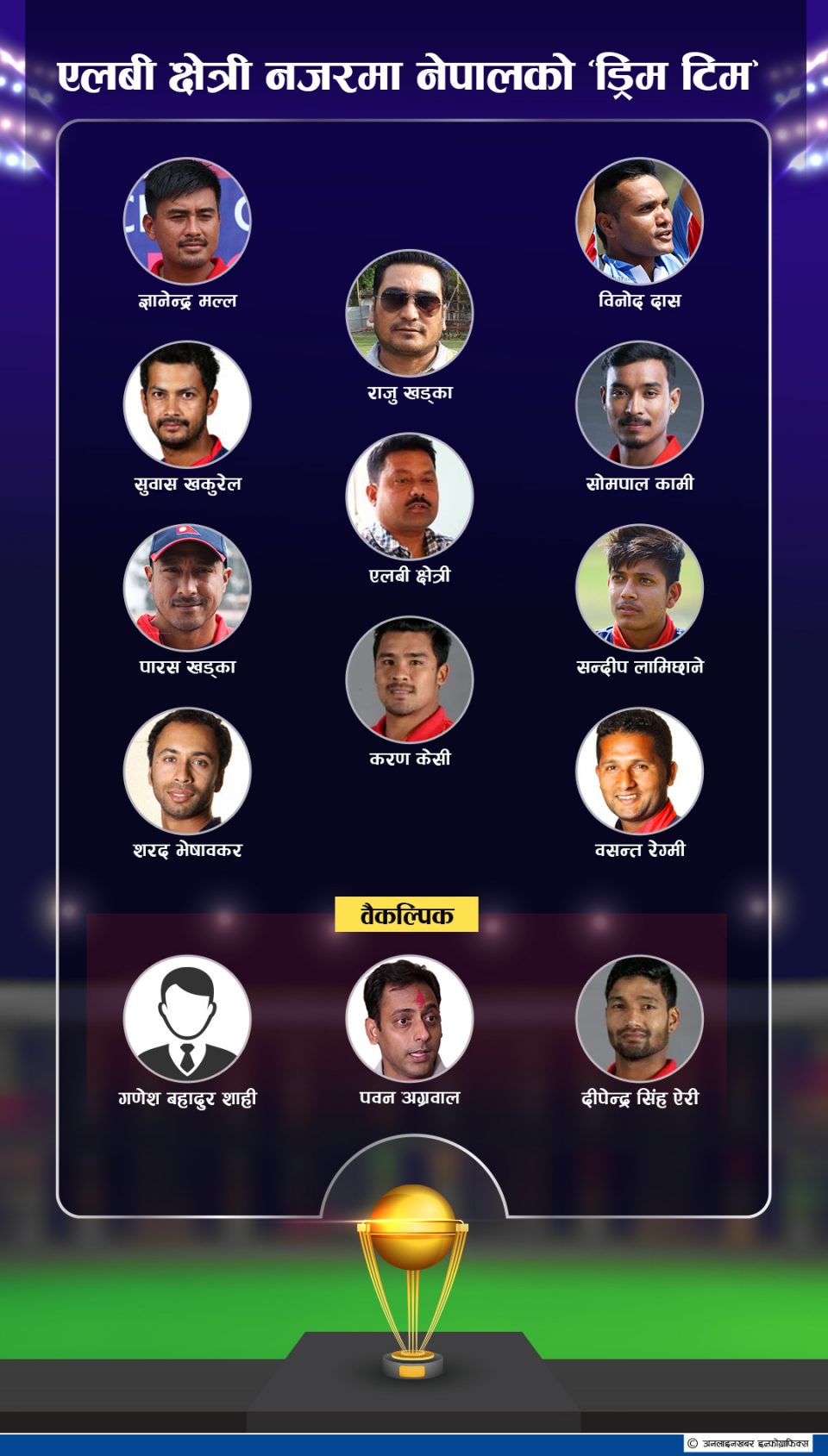 नेपालको लागि पहिलो अन्तर्राष्ट्रिय क्रिकेट टिमको उपकप्तान र पछि नेपाली टिमको कप्तानी गरेका लेख बहादुर (एलबी) क्षेत्रीलाई हामीले यस्तो ड्रिम टिमको कल्पना गर्ने अभिभारा सुम्पियौँ । नेपालको महिला क्रिकेट विकासमा समेत महत्वपूर्ण भूमिका खेलेका क्षेत्रीको ‘कप्तान १९९८’ पुस्तक समेत सार्वजनिक भएको छ ।