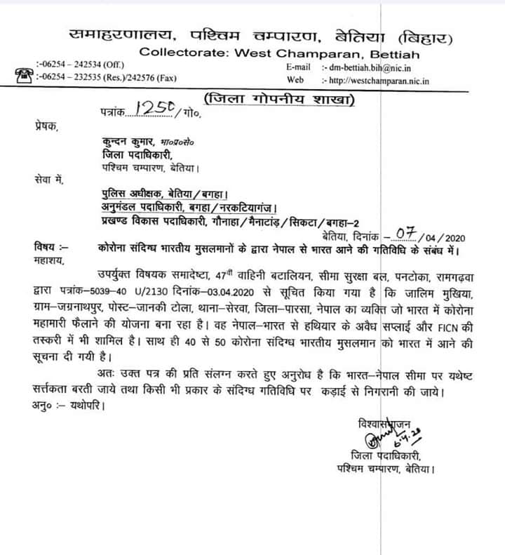 भारत बिहार राज्यको पश्चिमी चम्पारणका जिल्ला अधिकारीले प्रहरी अधिकारीलाई पर्साका जालिम मुखियाले भारतमा कोरोनाको संक्रमण फैलाउने योजना बनाएको एसएसबीले जनाएको भनेर चिट्ठी लेखेका छन्। अप्रिल ६ तारिख अर्थात चैत २४ गते चिट्ठी लेखिएको छ।