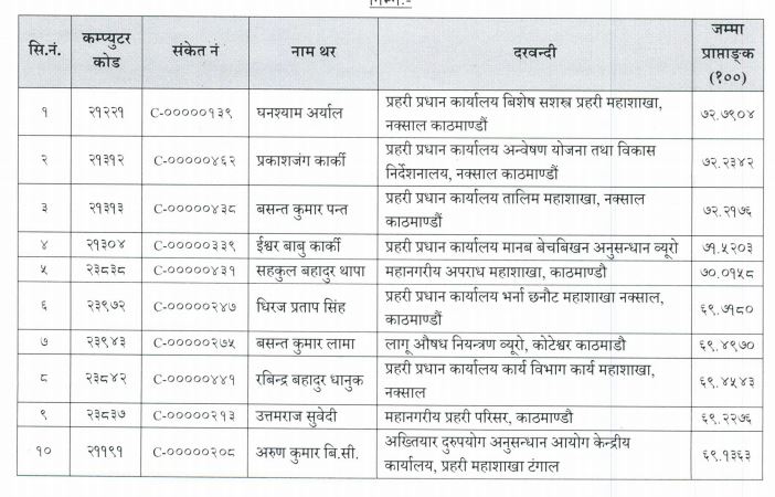 नेपाल प्रहरीको वेवसाइटमा प्रकाशित सूची अनुसार बढुवाको १ नम्बरमा घनश्याम अर्याल छन् भने त्यसपछि क्रमशः प्रकाशजंग कार्की र वसन्तकुमार पन्त छन् ।